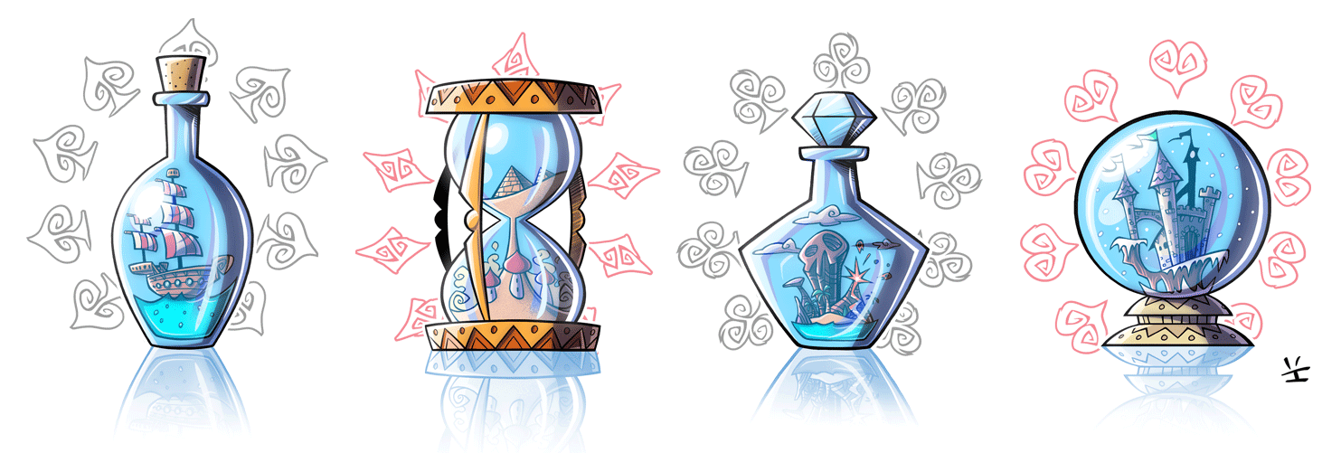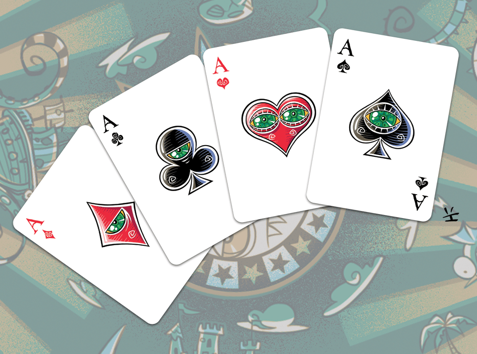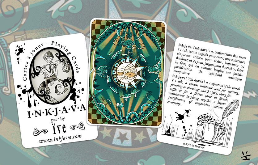 The very first and sublime playing card deck released by the Inkjava card shoppe! Discover four fantastic worlds through 54 cards featuring artworks emerging right from the imaginative mind of artist Ïve Bastrash. Sail the Seven Seas with its mythical aquatic creatures; cross the desert dunes and avoid its mischievous fauna; explore the dungeon of a medieval kingdom with its lunatic populace and scout through the jungles of a lost world without falling into the claws of the carnivorous indigenes! Suitable for every card game and players of all ages ready for an homeric voyage!